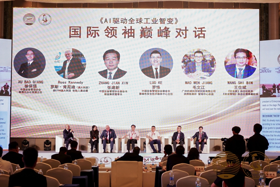 国际高峰对话由中国设备管理协会标准化办公室副主任徐保强主持,前CTPM澳大利亚创始人兼总裁Ross Kennedy、中国设备管理协会副会长、顺益(集团)董事长张建新、中国设备管理协会副会长兼绿色安全技术服务中心主任罗恪、广州机械科学研究院润滑检测所营销中心总监毛文江、《企业家》杂志社社长/《企业管理》杂志社常务副社长王仕斌,围绕“AI驱动全球工业智变”展开激烈讨论。对话从技术路径、管理变革、人才培养到国际协作,层层深入,呈现出一场跨文化、跨领域的思想盛宴。
