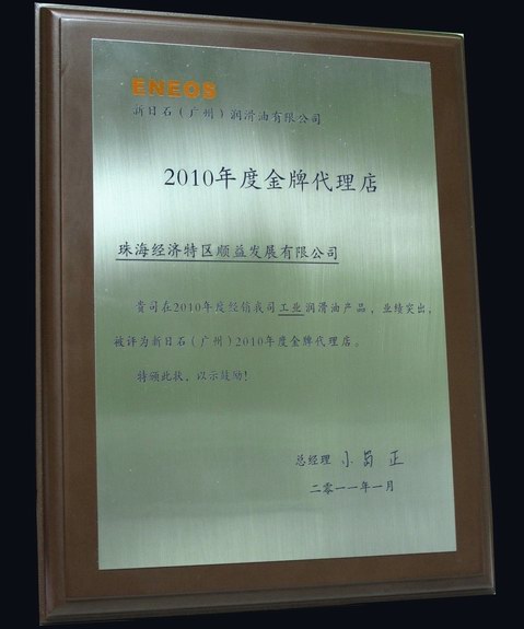 因2010年度,珠海经济特区顺益发展有限公司在新日本石油节能润滑项目中所做出的杰出,吉昆日矿。)授予珠海经济特区顺益发展有限公司为“2010年度金牌代理店”奖。